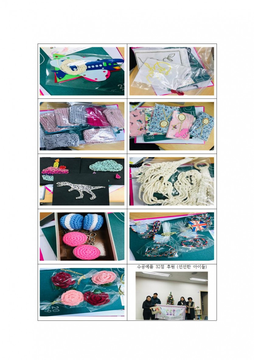 선선한 아이들에서 수공예품 32점을 후원해주셨습니다~ 페이지 정보 작성자 관리자 댓글 0건 조회 2,321회 작성일 19-12-06 00:21 목록 본문 페이스북 공유 트위터 공유 구글+ 공유 선선한 아이들에서 수공예품 32점을 후원해주셨습니다~ 이전글장애인 생활체육 프로그램(마지막회기) 19.12.17 다음글청소년 발달장애 당사자 미술활동 프로그램(9회기) 19.11.27