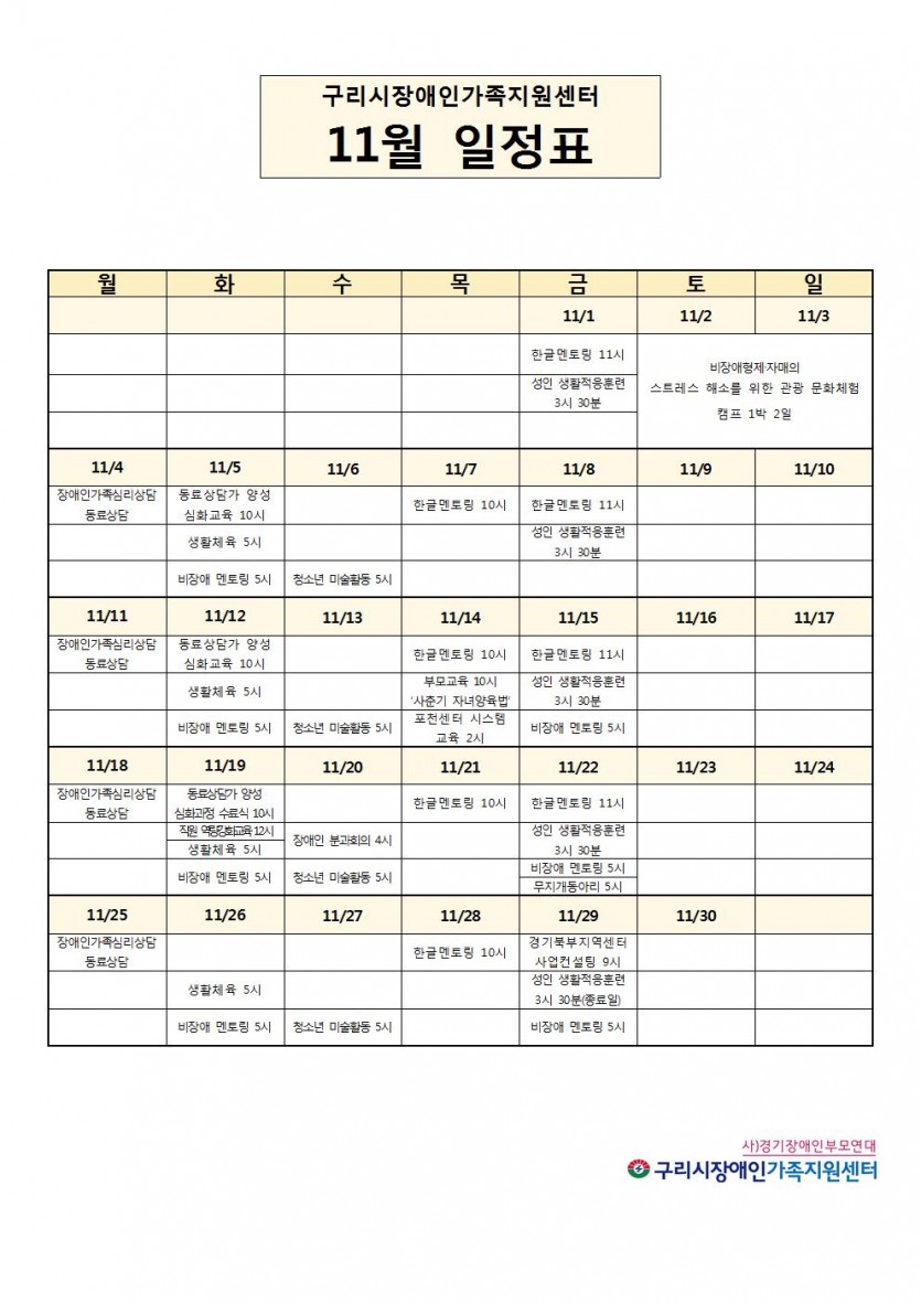 11월 센터일정표 페이지 정보 작성자 관리자 댓글 0건 조회 8,869회 작성일 19-11-05 00:18 목록 본문 페이스북 공유 트위터 공유 구글+ 공유 이전글12월 센터일정표 19.12.03 다음글센터 휴무일 공지(10/25, 28) 19.10.24 댓글 0 댓글목록 등록된 댓글이 없습니다.