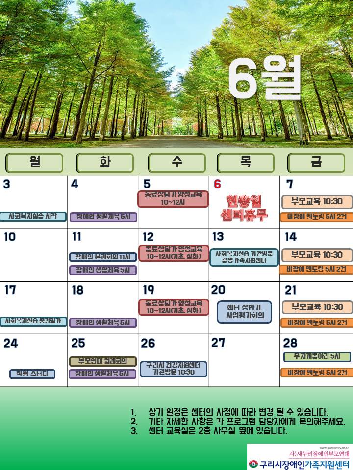 6월 센터일정표 페이지 정보 작성자 관리자 댓글 0건 조회 8,030회 작성일 19-06-03 00:18 목록 본문 페이스북 공유 트위터 공유 구글+ 공유 이전글센터 휴무일 공지(6/6) 19.06.03 다음글(연기) 2019년 발달장애인을 위한 성교육 19.05.24 댓글 0 댓글목록 등록된 댓글이 없습니다.