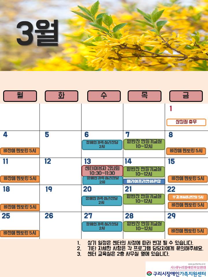구리시장애인가족지원센터 3월 일정표 페이지 정보 작성자 관리자 댓글 0건 조회 7,659회 작성일 19-02-26 00:18 목록 본문 페이스북 공유 트위터 공유 구글+ 공유 이전글합격공고) 단기근무 동료상담사 최종 합격자 발표 19.02.27 다음글센터 휴무일 안내(3/1) 19.02.25 댓글 0 댓글목록 등록된 댓글이 없습니다.