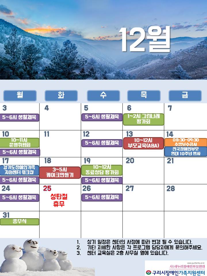 구리시장애인가족지원센터 12월 일정표 페이지 정보 작성자 관리자 댓글 0건 조회 8,964회 작성일 18-12-04 00:18 목록 본문 페이스북 공유 트위터 공유 구글+ 공유 이전글(완료) 구리시장애인가족지원센터 센터장 모집공고 19.02.27 다음글가족역량강화사업 비장애형제자매 캠프 참가자를 모집합니다. 18.10.10 댓글 0 댓글목록 등록된 댓글이 없습니다.