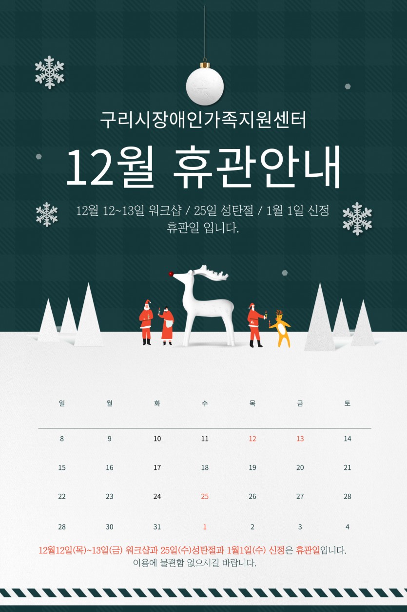 2024년 12월12(목)~13일(금) 전직원 워크샵, 25일(수) 성탄절, 1월1일(수) 신정에 따라 휴관임을 안내합니다.