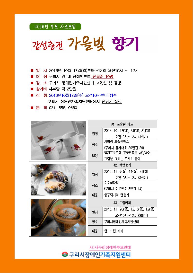 2016년 부모 자조모임 감성충전 가을빛 향기 (사진 첨부) 페이지 정보 작성자 김용기 댓글 0건 조회 8,763회 작성일 16-10-11 00:18 목록 본문 페이스북 공유 트위터 공유 구글+ 공유 이전글발달장애인 자립생활준비 체험홈 프로그램 모집안내 16.12.09 다음글발달장애부모 힐링 백일장 어머니, 나르샤 공고 16.09.28 댓글 0 댓글목록 등록된 댓글이 없습니다.