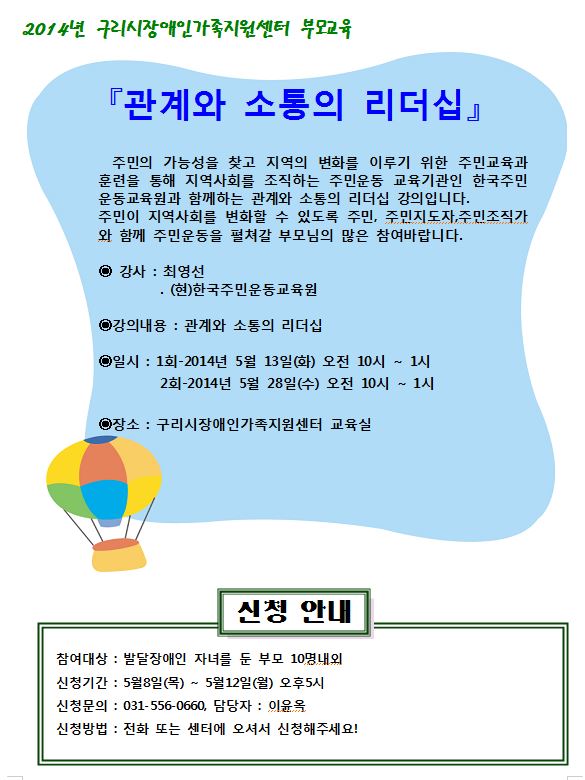 부모교육 <관계와 소통의 리더십> 페이지 정보 작성자 이윤옥 댓글 0건 조회 7,809회 작성일 14-05-09 00:18 목록 본문 페이스북 공유 트위터 공유 구글+ 공유 이전글부모교육 <사회적기업과 협동조합의 이해> 14.05.13 다음글<뮤지컬 체험,교육 프로젝트> 14.04.30 댓글 0 댓글목록 등록된 댓글이 없습니다.